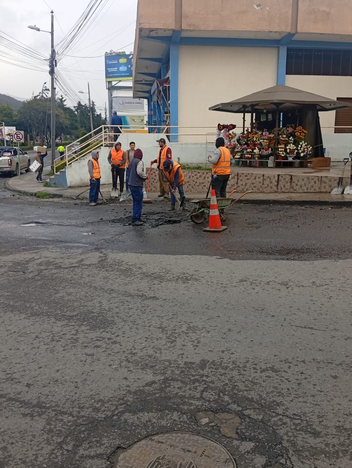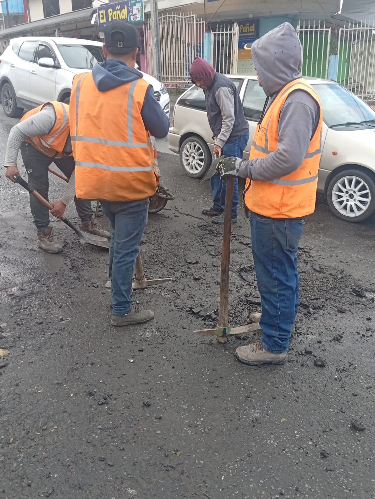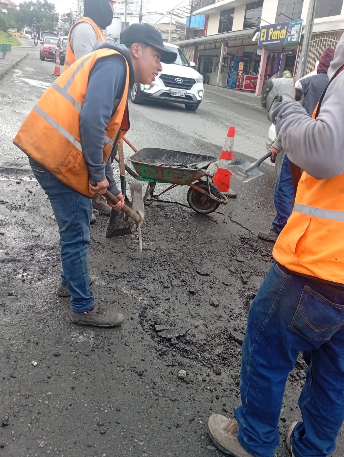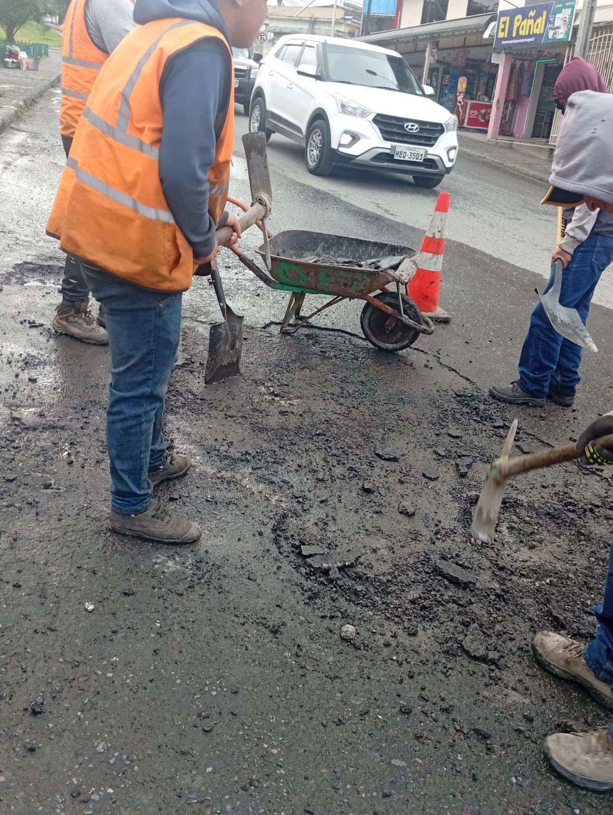 Bacheo y asfaltado en días anteriores, en el sector La Tebaida de la ciudad de Loja, se observa a varios trabajadores realizando labores de bacheo y asfaltado. Estos trabajos, ejecutados por el Municipio de Loja a través de la Dirección de Obras Públicas, iniciaron con el retiro del material deteriorado y la preparación del terreno para la posterior aplicación de asfalto en caliente.